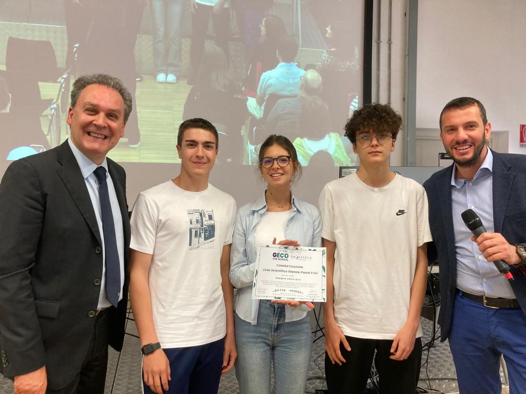 La classe 3DN del Liceo Scientifico Paolo Frisi è stata selezionata dal partner Daquatech di Valentina Lugini, membro del Comitato Scientifico di GECO For School per il premio speciale di questa edizione: un premio a sorpresa che prevede un erogatore a parete Daquatech per la scuola. Una soluzione ideale per le scuole, dove la funzionalità si sposa con la semplicità di utilizzo nel rispetto dell'ambiente e dei ragazzi.