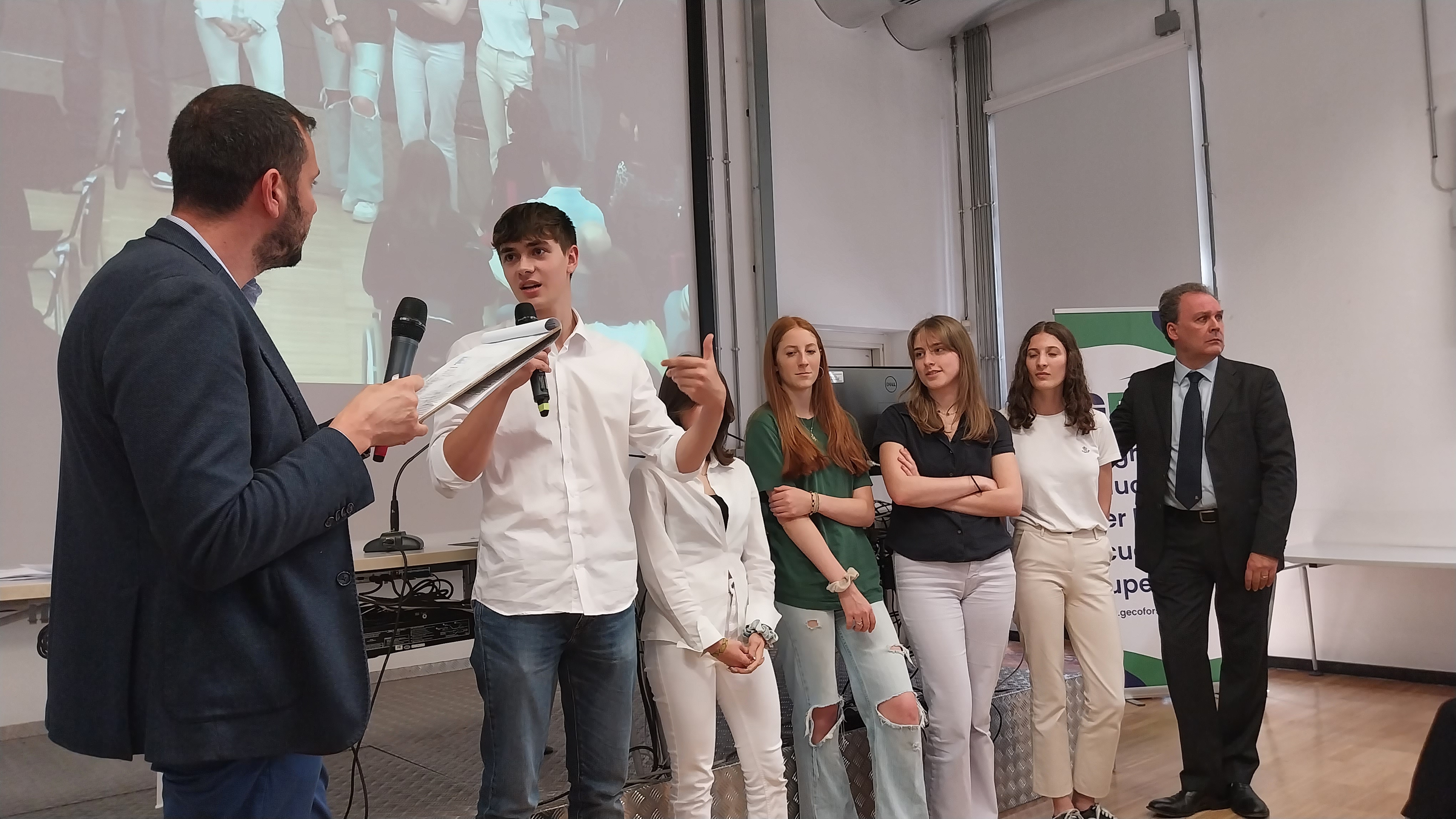 Qui Chiara Ranghetti dell’Istituto d’Istruzione Superiore Don Lorenzo Milani di Romano di Lombardia (Lombardia) che ha ricevuto i premi per le sue compagne vincitrici Vanessa Legramandi, Sofia Dassa, Giorgia Plebani, Chiara Canavesi, Jodie Finazzi e Nicole Corna; Francesca Tamagni dell’IIS Montale di Cinisello Balsamo (Lombardia) e Giorgio Ginoli del Liceo Bonaventura Rescigno di Roccapiemonte (Campania) vincitori del quarto premio: GenB, già partner del contest nazionale “La Tua Scuola Sostenibile” offre un kit di gadget bio-based per ogni studente. Il kit contiene una borraccia in bioplastica, un blocco con fogli ottenuti dai rifiuti organici degli erbivori, una borsetta in cotone riciclato e sughero, uno spazzolino da denti in bambù e un portachiavi in sughero. GenB è un progetto educativo finanziato dall’Unione Europea che punta a formare e a dare potere alle giovani generazioni interessate a tematiche ambientali, di sostenibilità e circolarità con particolare attenzione alla bioeconomia circolare. Sul palco, con loro, Daniele Capogna, Valentina Vavassori e Antonio Rancati.